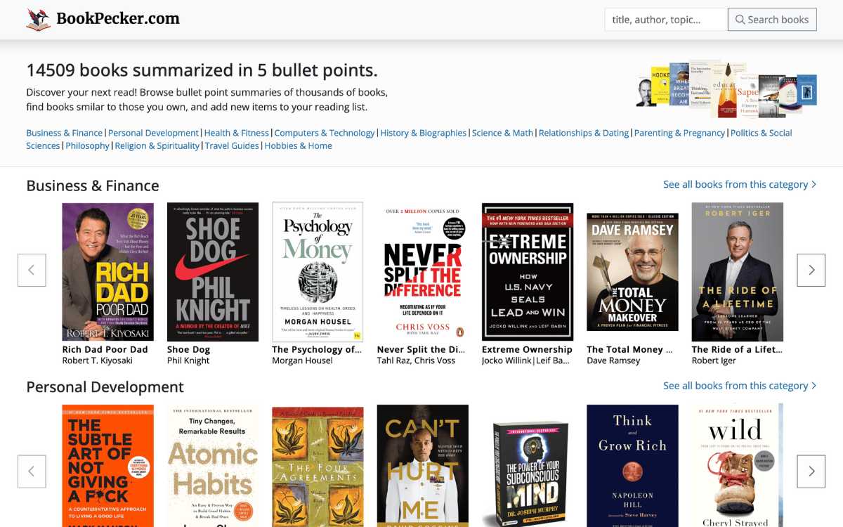 Browse bullet point summaries of thousands of books, find books similar to those you own, and add new items to your reading list.