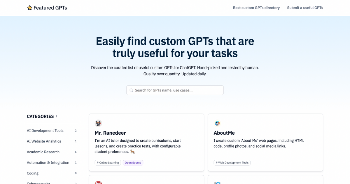 A directory for finding custom GPTs that are actually useful for all kinds of tasks!