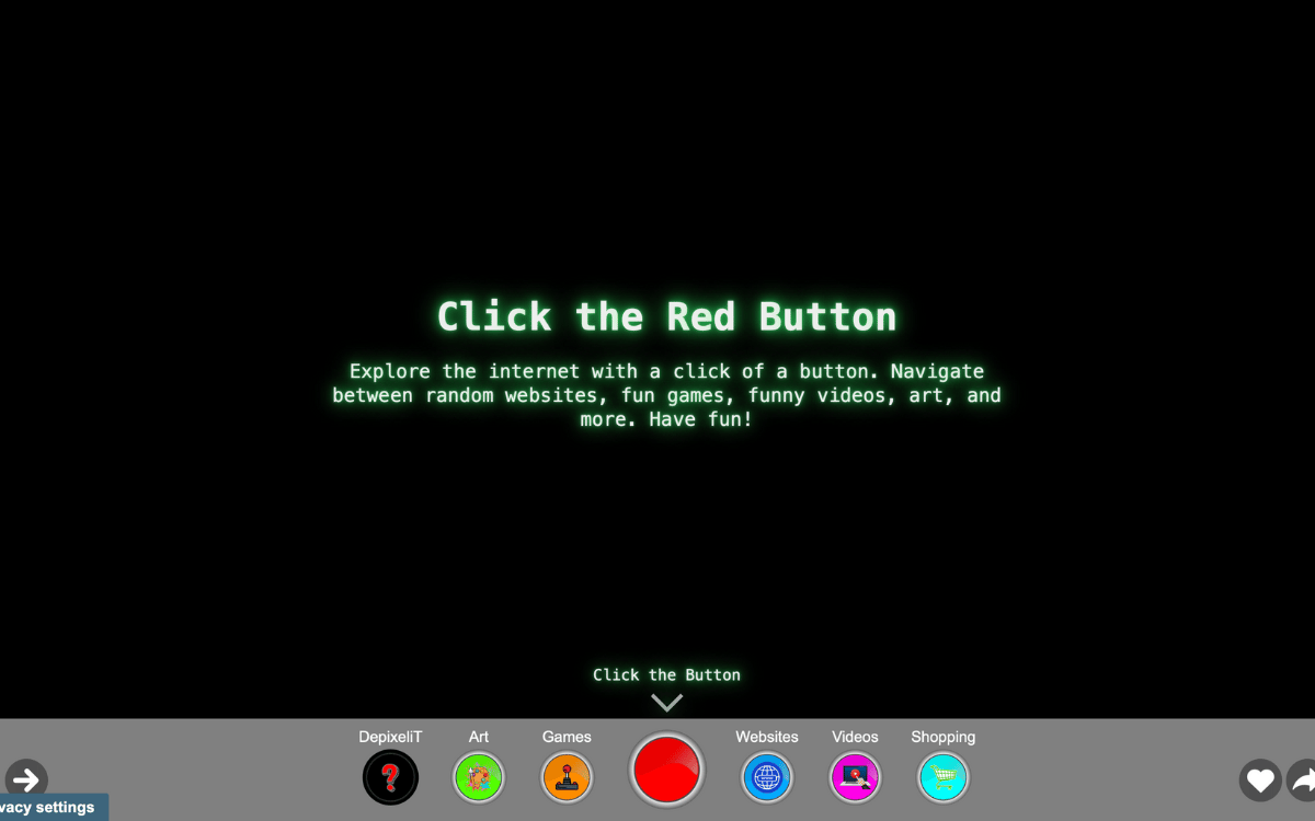 Navigate between random websites, fun games, funny videos, art, and more with a click of a button.