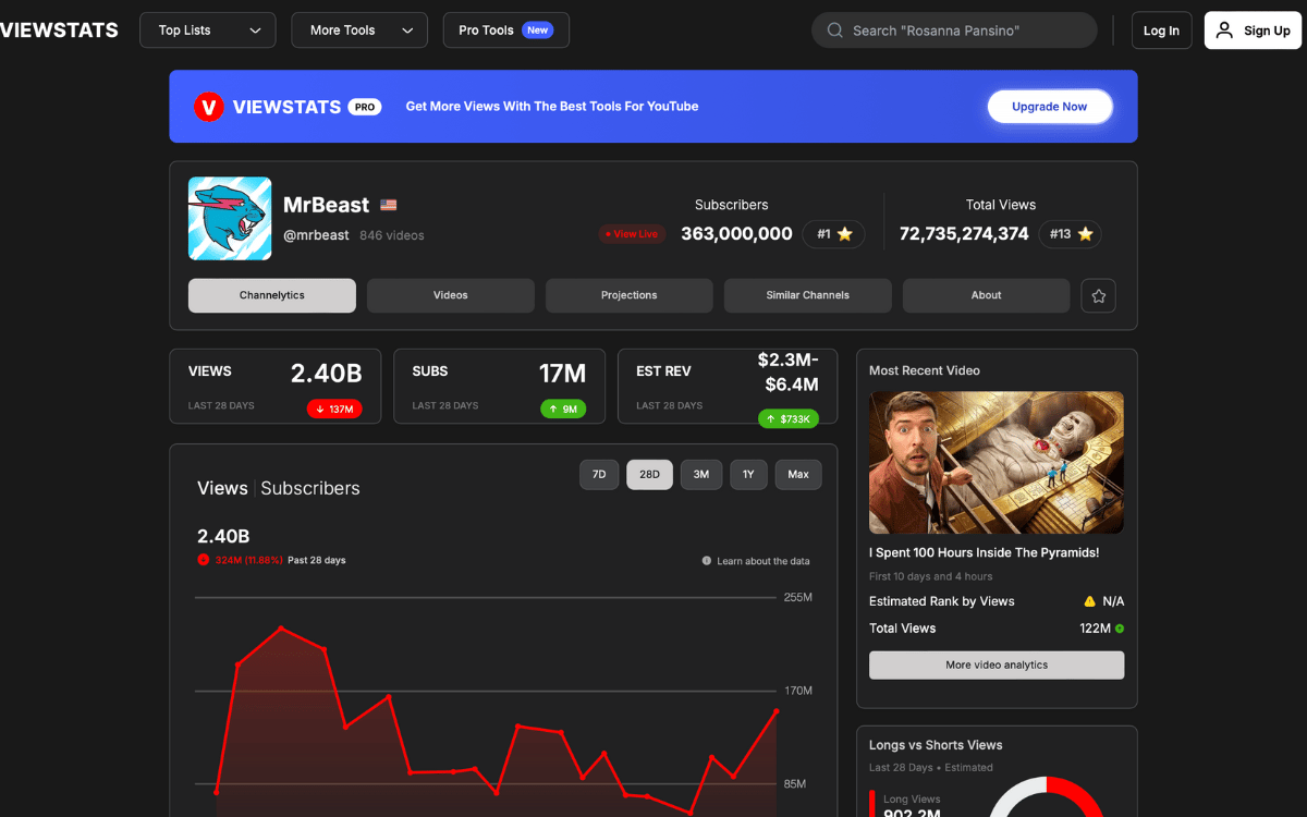 Browse statistics and reports from any YouTube channel, including their views, earnings and more.
