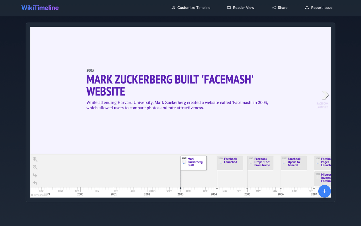 A tool that converts Wikipedia articles into interactive timelines, letting you discover surprising historical connections by comparing different timelines.