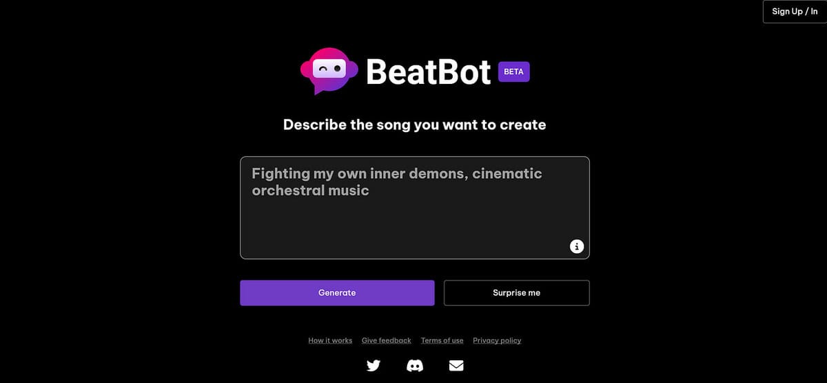 BeatBot is an AI song maker. Describe the song you want to create and click generate to see the results.