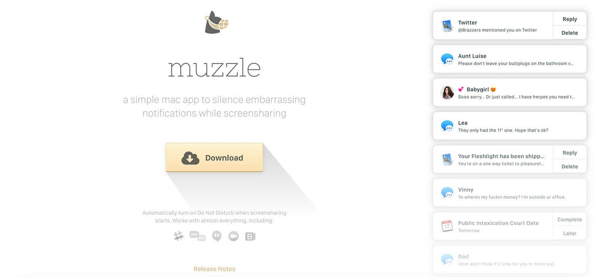 Muzzle is a simple mac app to silence embarrassing notifications while sharing your screen.