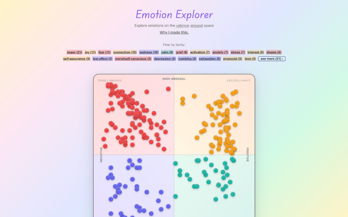 Ever struggle to name how you feel? This site maps 100+ emotions on a grid based on how pleasant or intense they are, to make it easier to understand what you’re feeling exactly.