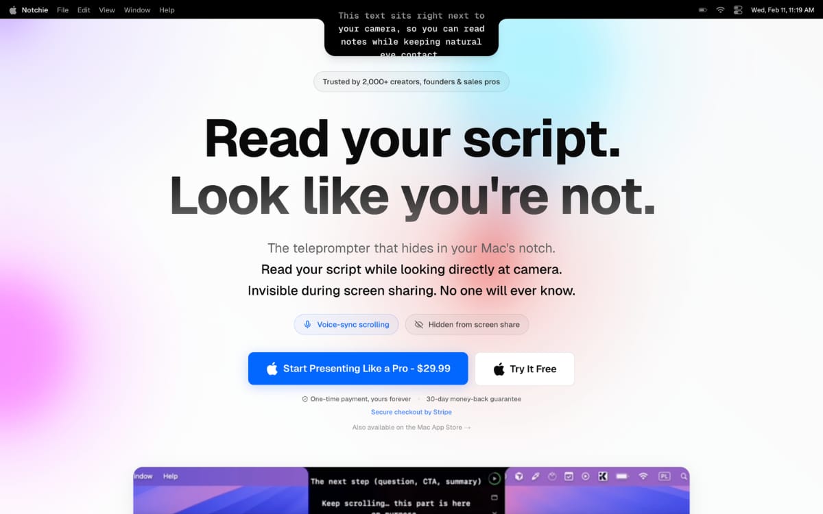 A neat Mac app that turns your MacBook’s notch into a hidden teleprompter so you can read scripts while keeping eye contact during video calls and recordings.
