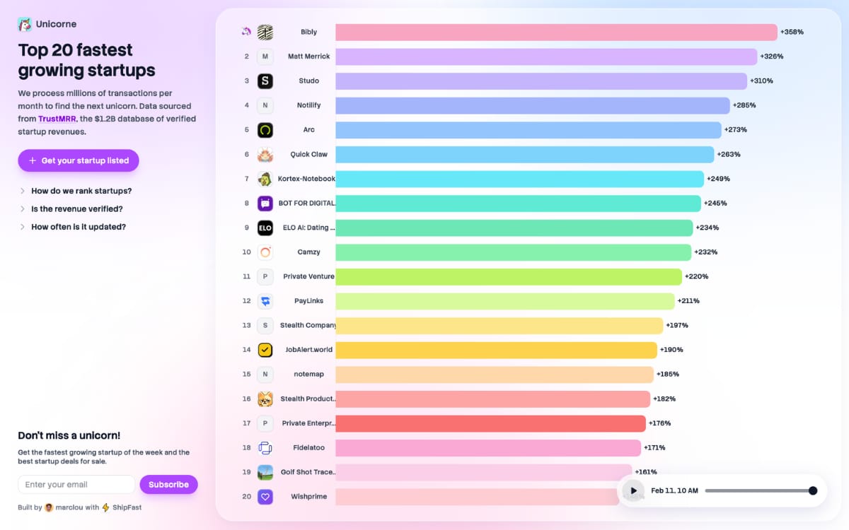 A real‑time leaderboard of the fastest growing software startups based on verified revenue data, showing the top 20 companies and how they’re trending.
