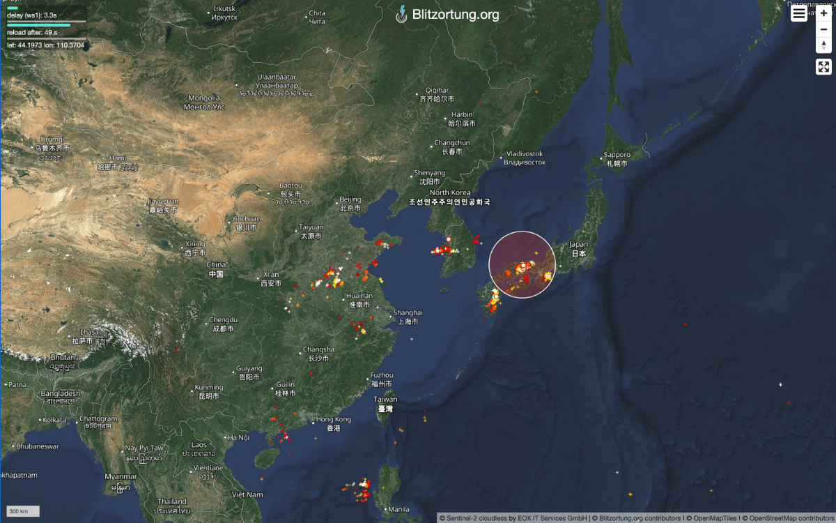 An entertaining map of real time lightning strikes around the world.