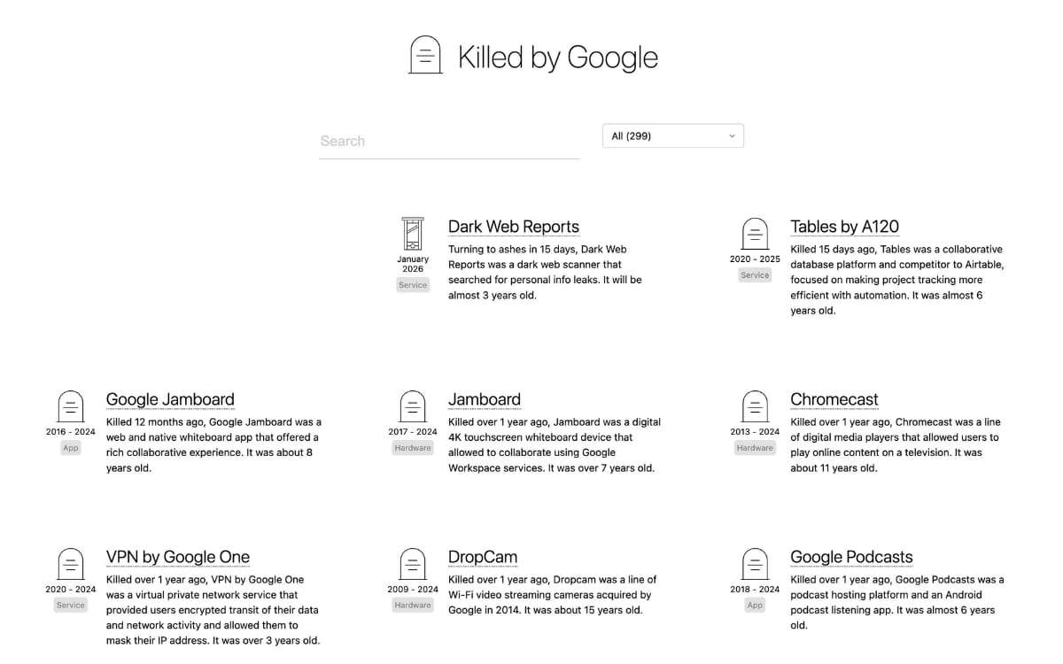 A catalog of Google products that have been shut down over the years, like a “graveyard” of discontinued offerings.