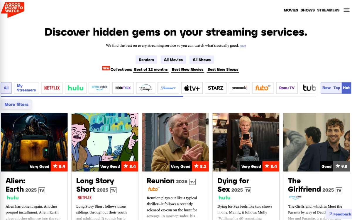 A curated movie site that helps you find highly rated but lesser-known films and shows, organized by streaming platforms you already use.