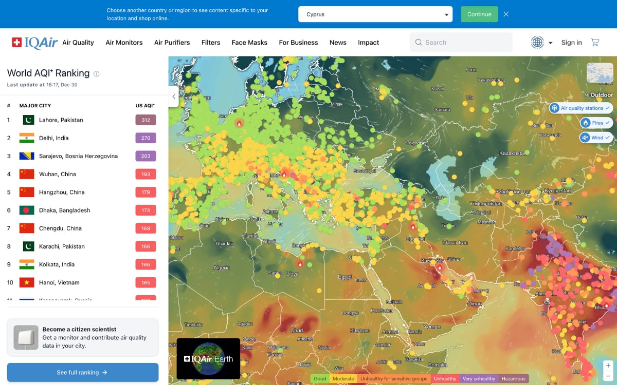 A live world air quality map that shows real‑time pollution levels for cities around the globe so you can see how clean or dirty the air is where you live or plan to visit.