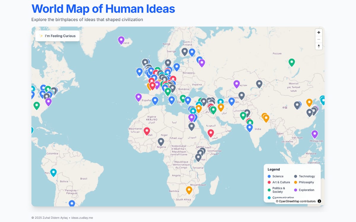 A visual map showing where over 250 of the world’s greatest ideas, discoveries, inventions and philosophies originated across centuries.