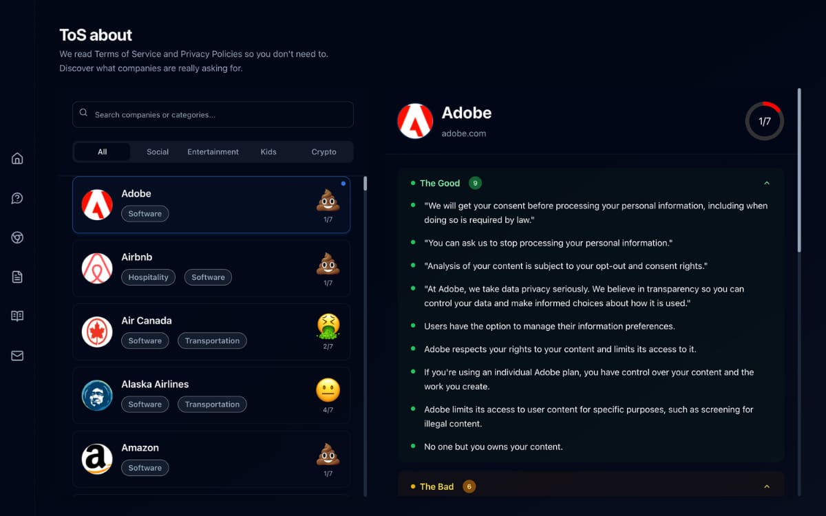A site that reads legal documents of popular services and highlights key points and red flags so you know what you’re agreeing to.
