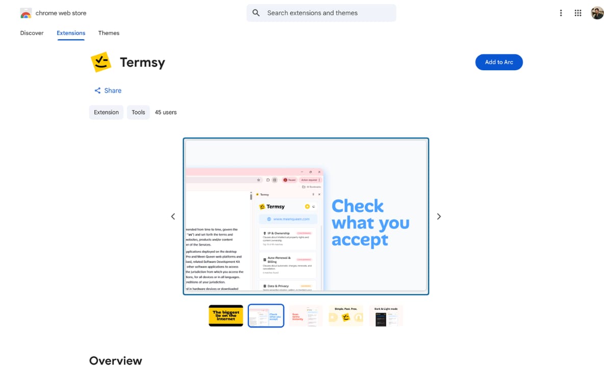 A Chrome extension that automatically scans Terms of Service and Privacy Policy pages, highlights critical clauses, and presents them in a sidebar for you to review.