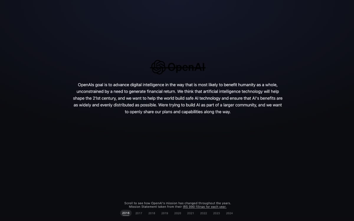 Scroll through a collection of OpenAI’s mission statements since 2016 to see how it has changed over the years.