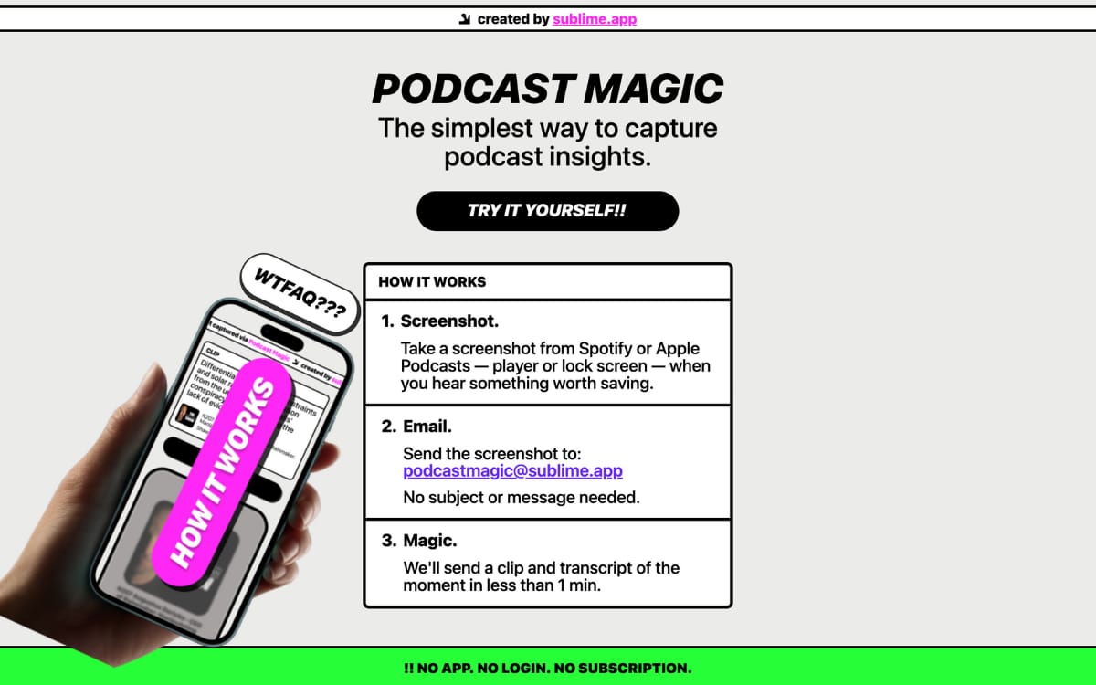 A simple tool to save your favorite podcast moments. Just screenshot from Spotify or Apple Podcasts, email it, and get a clip and transcript in under a minute.