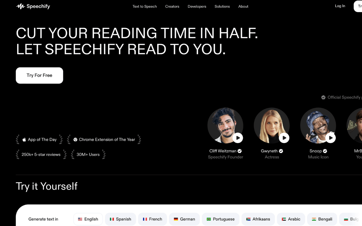 Speechify cuts your reading time in half by reading you any PDF, book or document you ask for.