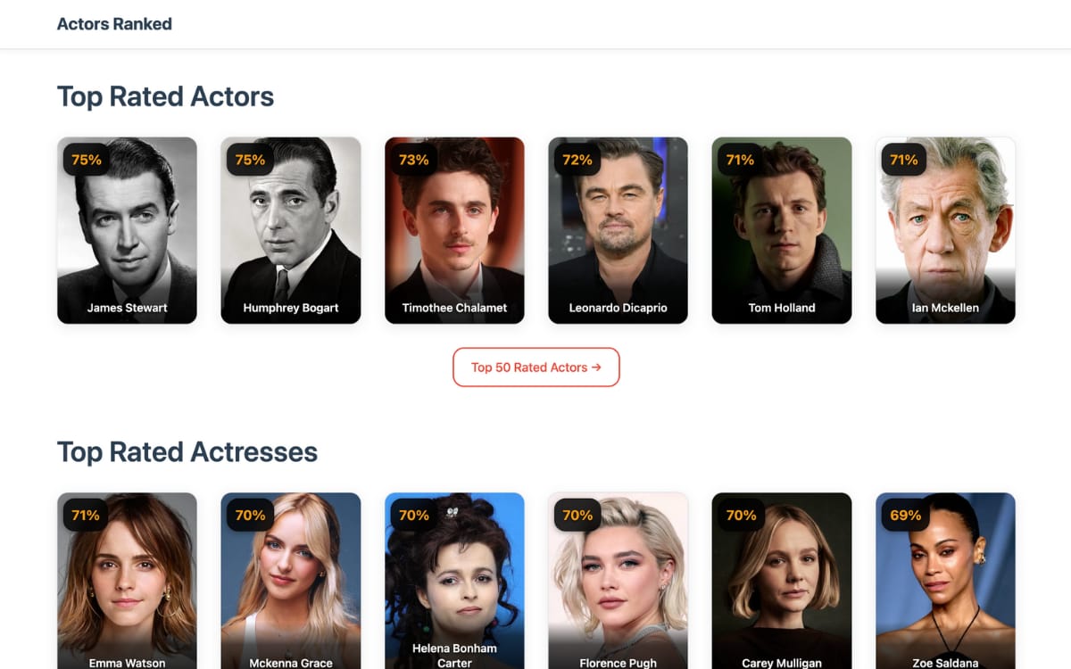 A site that ranks actors by their average movie ratings and shows stats like top and bottom films so you can see who consistently scores well on screen.