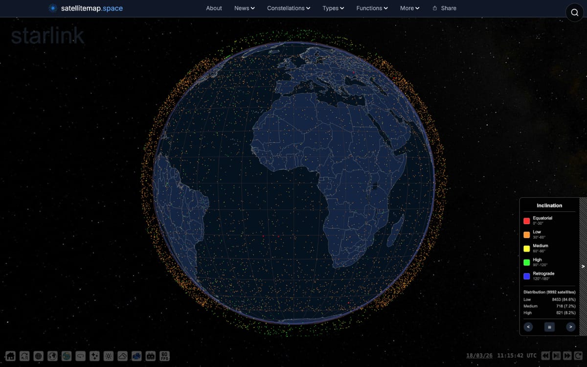 A map that lets you track Starlink satellites in real time as they orbit the Earth.