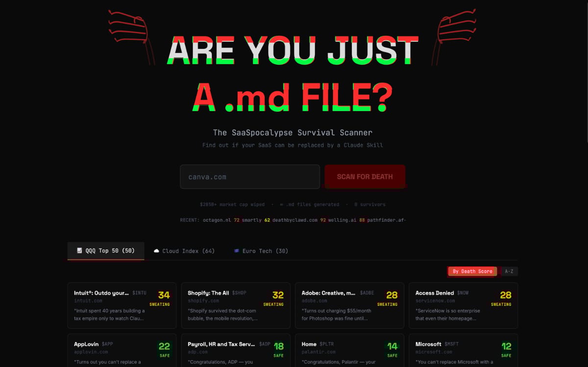 A site that checks if your startup idea could be replaced by AI tools and shows how vulnerable it is. It also has already-done analysis on several popular software products.